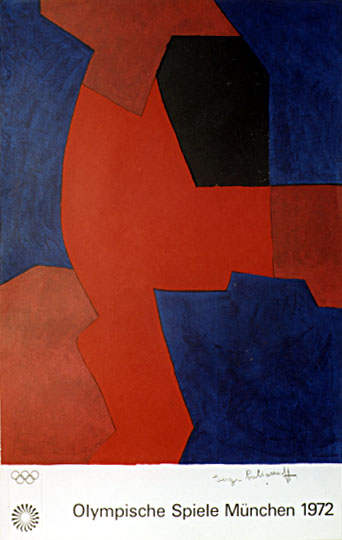 | Serge Poliakoff was born on January 8, 1900 in Moscow, Russia.  He fled the Russian Revolution in 1917 and went to Constantinople, Turkey.  In 1923 he moved to Paris, France where he worked as a cabaret guitarist and began to study art. In 1935 he studied art in London. He was strongly influenced by the work of Vasily (Wassily) Kandinsky (Lawyer turned artist; Born in Moscow 1866, German citizen 1928, French citizen 1939, died 1944). Poliakoff's art is in the abstract genre -- he used colors without form. His works are in numerous museums around the world. His works include five textile designs printed on cotton fabric in France in the late 1940's. He designed the 1972 wine bottle label for Chateau Mouton-Rothschild, one of the many world-famous artists who have been commissioned to illustrate the wines from this famous winery in the Bordeaux region of France.  He died in Paris, France on October 12, 1969 before his Olympic poster was actually printed.